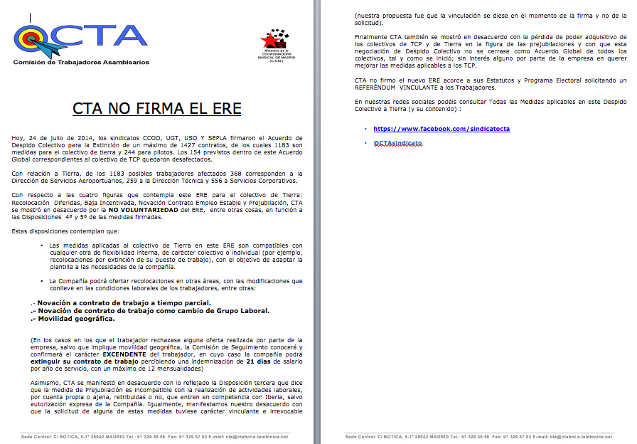 CTA no firmo el nuevo ERE acorde a sus Estatutos y Programa Electoral solicitando un REFERÉNDUM VINCULANTE a los Trabajadores.