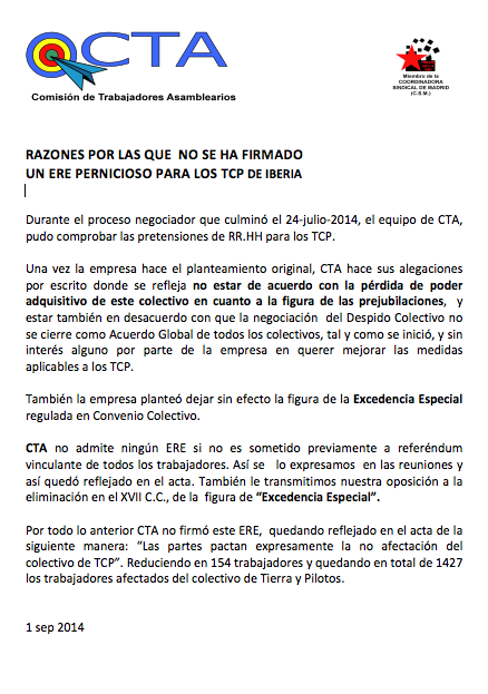 Por todo lo anterior CTA no firmó este ERE, quedando reflejado en el acta de la siguiente manera: “Las partes pactan expresamente la no afectación del colectivo de TCP”. Reduciendo en 154 trabajadores y quedando en total de 1427 los trabajadores afectados del colectivo de Tierra y Pilotos.