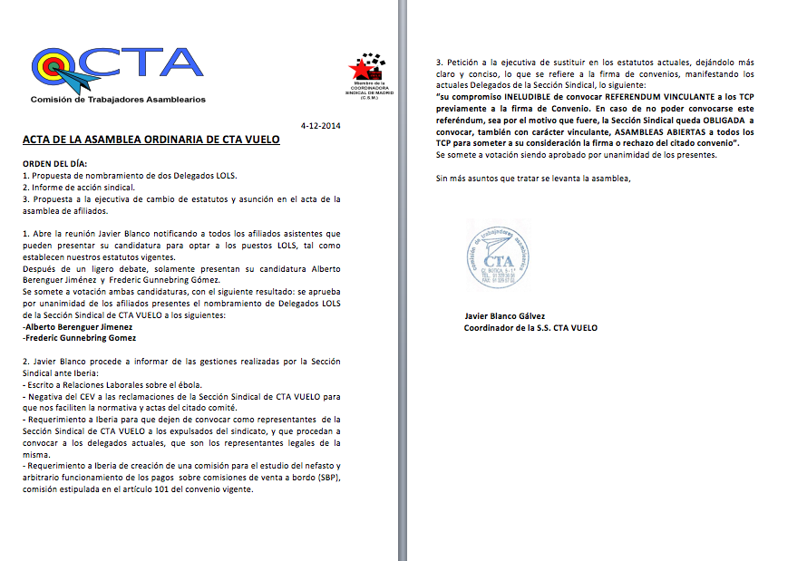Según el Acta de la  asamblea afiliados CTA Vuelo  del pasado 4-12-2014: